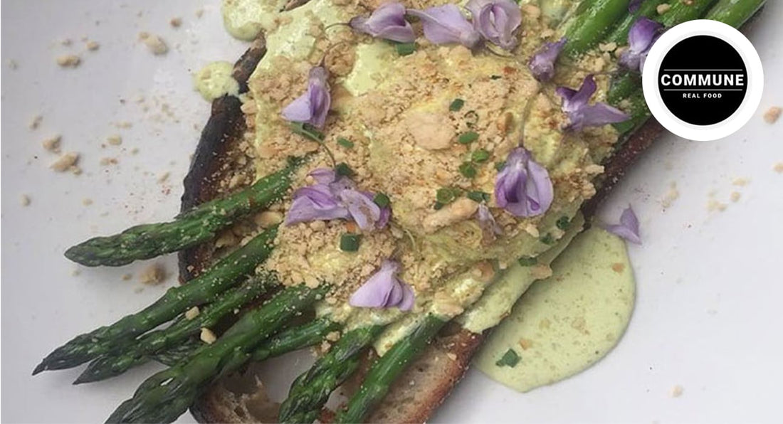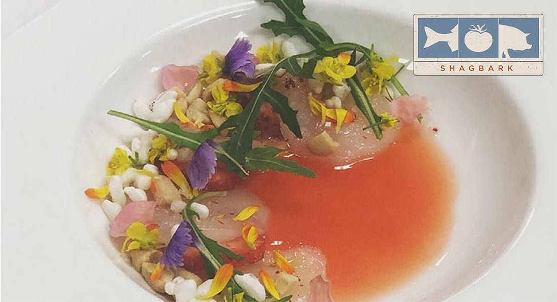 Scallop Crudo with puffed rice, Hubs peanuts, wild arugula, strawberry tea, and fresh spring blossoms.