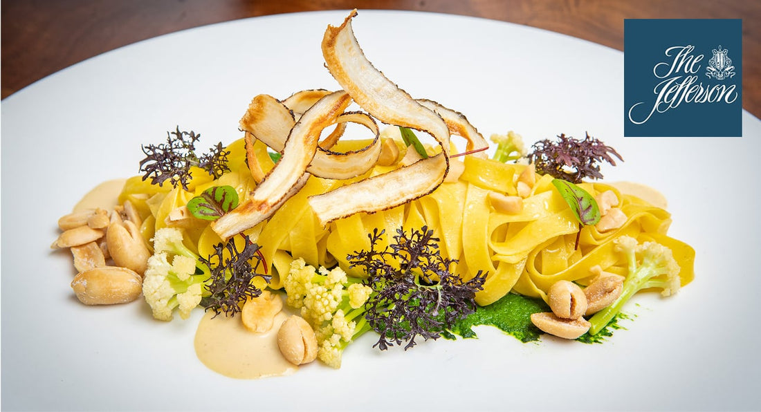 Farm Egg Fettuccine with pesto made from Hubs peanuts and local kale