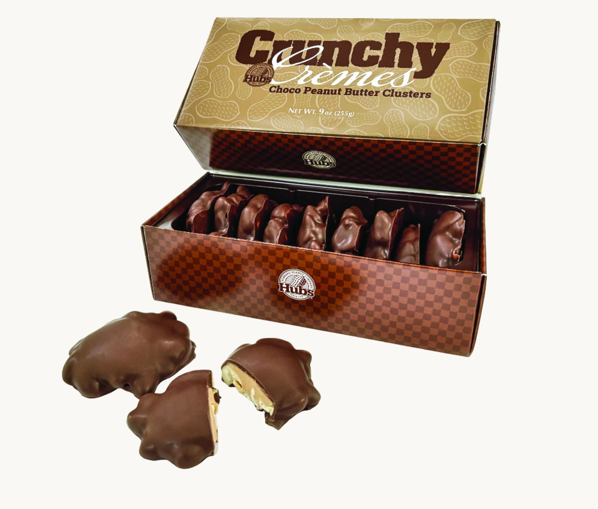 Elevate your snack offerings with Crunchy Cremes—a refined confection that celebrates over 70 years of Hubs Peanuts craftsmanship. These layered delights are a luxurious union of Hubs Home-cooked Virginia Peanuts, Silky Peanut Butter, and a Gourmet Choco Blend Shell. Ideal for sharing—or savoring solo—Crunchy Cremes bring together nutty Americana and chocolatey indulgence in perfect balance.